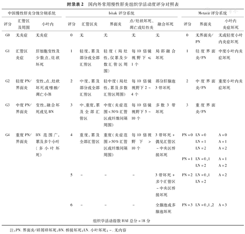 | 评分 | 汇管区及周围 | 小叶内 | 评分 | 汇管区炎 | 界面炎 | 点/灶状坏死、凋亡或灶性炎 | 融合坏死 | 评分 | 界面炎 | 小叶内炎症坏死 |