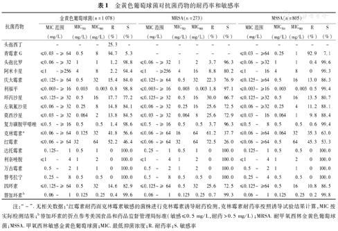 | 抗菌药物 | 金黄色葡萄球菌(n=1 078) | MRSA(n=273) | MSSA(n=805) | ||||||||||||