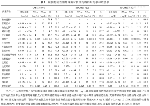 注:"-".无相关数据;a伪中间葡萄球菌和施氏葡萄球菌用苯唑西林(1 μg),路邓葡萄球菌的检测和判读方法同金黄色葡萄球菌;b头孢比罗的折点参考金黄色葡萄球菌折点;c红霉素耐药而克林霉素敏感的菌株进行克林霉素诱导耐药检测,克林霉素耐药率按照诱导试验结果计算,MIC按实际检测结果;d替加环素的折点参考美国食品和药品监督管理局标准(敏感≤0.5 mg/L,耐药>0.5 mg/L);CNS.凝固酶阴性葡萄球菌;MRCNS.耐甲氧西林凝固酶阴性葡萄球菌;MSCNS.甲氧西林敏感凝固酶阴性葡萄球菌;MIC.最低抑菌浓度;R.耐药率;S.敏感率