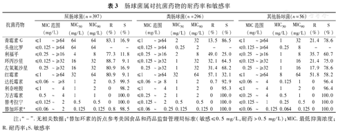 | 抗菌药物 | 屎肠球菌(n=397) | 粪肠球菌(n=296) | 其他肠球菌(n=56) | ||||||||||||