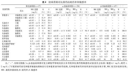按注射青霉素G非脑膜炎折点,未发现耐青霉素肺炎链球菌。肺炎链球菌、β-溶血链球菌和α-溶血链球菌对利奈唑胺和万古霉素均敏感,对头孢曲松、头孢吡肟、美罗培南和达托霉素均有较高的敏感性。与肺炎链球菌相比,β-溶血链球菌和α-溶血链球菌对复方磺胺甲噁唑敏感性较高(表4)。