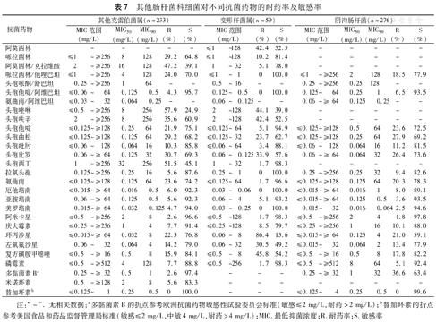 | 阿米卡星 | ≤0.5~≥256 | 2 | 8 | 2.6 | 96.6 | ≤0.5~128 | 1.7 | 98.3 | ≤0.5~≥256 | 2 | 4 | 1.8 | 97.8 |