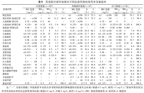 | 氨曲南 | ≤0.125~≥128 | 0.125 | 64 | 23.6 | 74.2 | ≤0.125~64 | 1.7 | 96.6 | ≤0.125~≥128 | 0.125 | 64 | 20.3 | 78.3 |