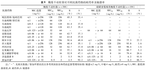 耐碳青霉烯类鲍曼不动杆菌(Carbapenem-resistant Acinetobacter baumannii,CRAB)占63.0%(194/308)。鲍曼不动杆菌和CRAB仅对多黏菌素B和替加环素有较高的敏感率(均>88.0%),对其他抗菌药物敏感率均<50.0%(表9)。