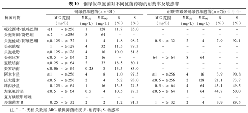 | 抗菌药物 | 铜绿假单胞菌(n=401) | 耐碳青霉烯铜绿假单胞菌(n=76) | ||||||||