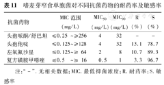 | 头孢唑啉 | ≤0.5~≥256 | 8 | 256 | 57.9 | 24.9 | 2~ 128 | 44.1 | 39.0 | - | - | - | - | - |