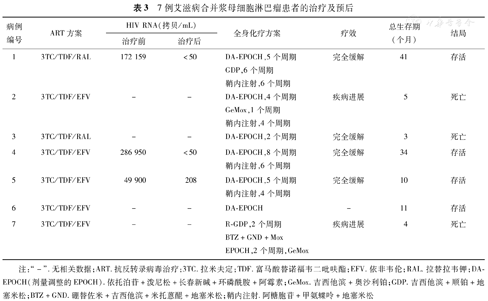注:"-".无相关数据;ART.抗反转录病毒治疗;3TC.拉米夫定;TDF.富马酸替诺福韦二吡呋酯;EFV.依非韦伦;RAL.拉替拉韦钾;DA-EPOCH(剂量调整的EPOCH).依托泊苷+泼尼松+长春新碱+环磷酰胺+阿霉素;GeMox.吉西他滨+奥沙利铂;GDP.吉西他滨+顺铂+地塞米松;BTZ+GND.硼替佐米+吉西他滨+米托蒽醌+地塞米松;鞘内注射.阿糖胞苷+甲氨蝶呤+地塞米松