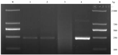 注:M.DNA标准带;1、2.患者致病性钩端螺旋体23S rRNA的特异性扩增条带;3.阴性对照;4.阳性对照