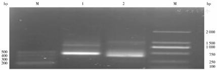 注:M.DNA标准带;1、2.患者致病性钩端螺旋体23S rDNA的特异性扩增条带