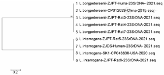 此外,在不同国家和地区,家鼠钩端螺旋体感染的患病率差异很大,在中国的流行率为3%[14]。追溯患者流行病学史,其在发病前曾有鼠类接触史,且日常所处生活环境有较多鼠类。进一步将其血清中的博氏致病性钩端螺旋体23S rDNA序列聚类分析发现,与本地3号、4号、7号老鼠肾中的博氏致病性钩端螺旋体23S rDNA序列同源性一致(100%),提示患者血清中钩端螺旋体与老鼠携带的钩端螺旋体密切相关,这从病毒基因同源性上为舟山可能发生人畜间传播风险提供了证据。同时,进化树示其与2021年岱山老鼠携带的问号钩端螺旋体分属不同进化树分支,表明舟山存在两种或更多钩端螺旋体基因型。