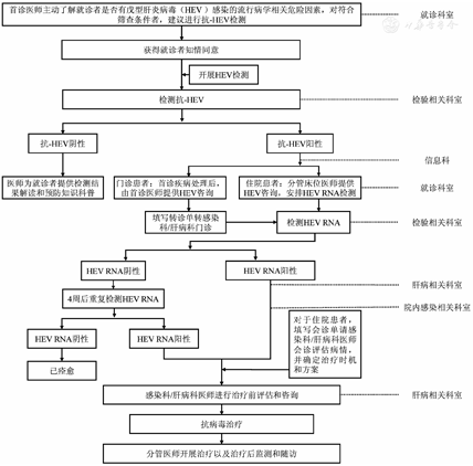 包括感染性疾病科、肝病科和消化科等相关科室,对具有指征人群进行筛查、对转诊的抗-HEV阳性者提供咨询和确诊检测、对HEV RNA阳性者提供治疗咨询,对符合条件者进行治疗并监测,提高患者依从性。同时,科室协助制订戊型肝炎筛查和管理制度、岗位职责和工作程序,参与管理质量控制指标分析,落实好传染病报告和临床诊断、治疗和随访的工作。