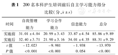 信息能力是自主学习中运用工具的能力,主要表现在本科护生对学习客体的选择和利用上。拥有信息能力的学习者能够有效识别信息的可利用度,解释和解读信息,进而对信息进行有选择的接受、加工、整合和改造。它包括信息获取能力、拓宽信息渠道的能力、信息分析、处理能力[10]。从表1看出,培训后的护生信息能力得分较培训前虽然有所提高,但差异无统计学意义(P>0.05)。这可能是护生已经学习过医学文献检索与利用、图书馆利用、护理研究等课程,对获取信息的途径及方法在培训前已比较熟悉,能够根据需要去浏览医学专业网站、检索数据库资源及查阅相关资料文献等。另一方面,短期的训练使护生在短时间内对获得的大量信息进行加工、处理能力的提高效果还不太明显,以后应着重这方面能力的培养。