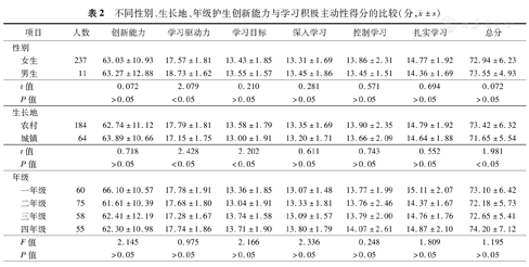 不同性别、生长地、年级护生创新能力与学习积极主动性得分的比较(分,