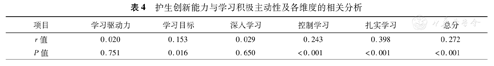 护生创新能力与学习积极主动性密切相关:表3提示不同创新能力水平护生学习积极主动性及其各维度明显不同,创新能力水平程度高、中等者其学习积极主动性以及学习目标、控制学习、扎实学习维度均明显高于创新能力水平程度中等偏低、低者。经相关分析(表4),发现护生创新能力水平与学习积极主动性总分及学习目标、控制学习、扎实学习3个维度呈正相关(P<0.05)。表明学习积极主动、学习目标明确、学习控制力强、学习态度扎实的护生更愿意接受新知识、参加实践活动,其创新能力水平程度也高。