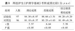1.随机抽取本院2013级3年制高职护理专业2个班为试验组(97人),2个班为对照组(96人),护生均为女性。两组学生在年龄(19~21岁)、已修课程的成绩、教材、授课内容等方面比较,差异均无统计学意义(均P>0.05),具有可比性。两组均由同一教学小组教师主讲及实训指导。试验组采用新的课程体系进行教学,对照组采用传统教学方法,即先由教师授课,整体连贯性示范实训操作,然后护生再进行分组练习。期末的时候对两组护生的理论、技能和综合情景模拟成绩进行比较。