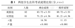 见表1。与对照组比较,观察组学生分数较高,差异有统计学意义(P<0.05)。