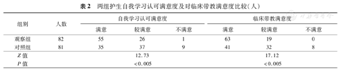 两组护生自我学习认可满意度及对临床带教满意度比较(人)