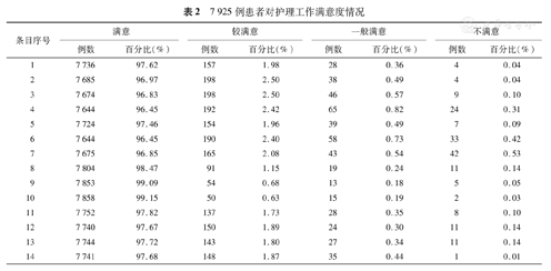 患者对护理工作满意度是患者对理想护理的期望与实际接受护理照顾的一致程度[1]。患者满意度可较客观地反映医疗服务质量,是衡量医院质量管理工作的金标准。护理队伍是医院第一线的形象代表,在工作中与患者接触密切,是影响患者对整体医疗服务满意度的重要因素[2,3]。为提高优质护理服务水平,满足不同层次的患者需求,陕西省人民医院护理部结合国内外经验,设计了"住院患者对护理工作满意度调查表"为患者提供优质服务,认为有较好的针对性和可信度,值得在护理工作中应用与推广。