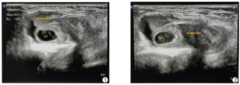 超声检查是诊断各种类型疝的首选检查方法,优于其他影像学检查,准确性和敏感性较高。高分辨力超声能明确疝内容物的性质,提示疝内肠壁有无水肿、穿孔,周围有无渗出、粘连等重要信息,利于临床选择合理的治疗方法。Littre疝超声表现有以下特点:①疝囊内可见一段异常肠袢,呈具有盲端的管状结构,一端与回肠相连;②疝囊内除异常肠袢外,可伴或不伴其他肠管;③异常肠袢位置固定,黏膜层、肌层及浆膜层不同程度的增厚,肠壁回声减低,边界模糊,考虑伴发憩室炎;④异常肠袢腔内张力减低,壁连续性中断,周围可见无回声液区,考虑伴发憩室穿孔。