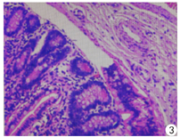 患儿,男,8岁,以"左侧腹股沟区不可复性肿物1 d余"为代主诉入院。1 d前家属发现患儿左侧腹股沟区出现一肿物,固定不能还纳,伴呕吐8次,非喷射性,为胃内容物,量较多,并伴腹痛、腹胀,无畏寒、发热,无腹泻、便秘,就诊于当地医院,考虑小肠梗阻,予以开塞露灌肠及输液等对症治疗,具体用药不详,症状无明显缓解,遂急诊转入院。入院后查体:患儿一般情况可,心、肺查体未见明显异常;腹膨隆,全腹轻压痛,无反跳痛;男性外阴;左侧腹股沟区触及一肿物,大小约3.5 cm×2.5 cm×2.5 cm,边界清,表面光滑,呈椭圆形,质韧,伴触痛,未坠入阴囊。用手将其向上进行挤压,不可还纳入腹腔,指压外环见外环口增宽。右侧腹股沟区未及肿物。双侧睾丸阴囊内未触及。血常规:白细胞计数(WBC)12.2×109/L,中性粒细胞百分率(NEUT) 49.3%。超声检查:①左侧腹股沟区可及一混合回声,大小约4.5 cm×1.8 cm×2.3 cm,边界清,其内为肠管回声,并可见一段异常肠袢,大小约2.5 cm×1.5 cm,壁增厚,回声减低,其一端与小肠相连,一端为盲端。此肿物向上延伸与腹腔相通,测疝径0.7 cm。见图1、图2。②双侧睾丸均位于腹股沟管,大小正常,轮廓规则,回声均匀。腹部DR平片:上腹部肠管胀气,并可见一长气液平面,中下腹部较密实,考虑肠梗阻。初步诊断为:1.左侧腹股沟嵌顿疝;2.不全性肠梗阻;3.双侧隐睾。遂于全身麻醉下行腹腔镜探查,术中见左侧腹股沟管内环口未闭,直径约0.8 cm,肠管位于内环口内,左侧睾丸位于左侧腹股沟管,可被牵拉入阴囊内,松手后睾丸回缩入腹股沟管内。右侧股沟股管内环口未闭,直径约0.5 cm,探查腹股沟管内环口远端约2.0 cm处可见睾丸回声,不能拉入阴囊内,向患儿家属告知病情后,暂不予以特殊处理。术中证实为左侧腹股沟嵌顿疝。腔镜直视下给予左侧腹股沟嵌顿疝复位,复位成功后见嵌顿肠管系膜对侧有一约1.5 cm×3.0 cm憩室,充血水肿,邻近肠管缺血坏死,长度约10.0 cm。首先于腔镜下常规行左侧疝囊高位结扎术,并沿脐窝下褶皱切口,用无损钳将憩室提出,处理回肠及憩室对应系膜,切除此段坏死肠管约10.0 cm及憩室,行端端吻合,全层间断缝合,浆肌层包埋,关闭系膜孔,逐层缝合切口。术后病理示:光镜下憩室内衬肠黏膜,肠壁及憩室淤血水肿、局部出血、少许炎细胞浸润(图3),考虑(回肠)Meckel憩室。术后患儿恢复良好,切口无明显疼痛,痊愈出院,术后1个月电话随访,状况良好,无特殊不适,疝无复发。