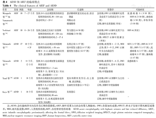 | Takanashi等[35] | AESD | 2 | 11个月、12个月 | 发热24 h内出现短暂全面强直阵挛发作惊厥持续时间:1~2 min病程第5天:惊厥复发(双向期),意识障碍1~2 d | 发育正常 | 急性期:病程第5-6天,DWI额叶高信号,其中1例伴顶叶高信号后期:中度脑萎缩 | 流感病毒A |