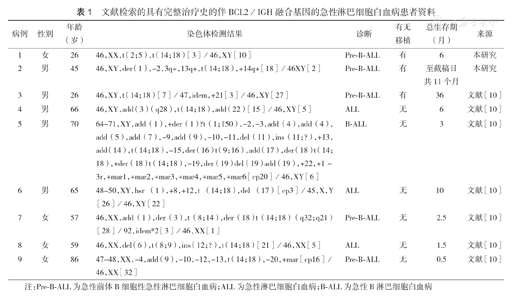 | 4 | 男 | 66 | 46,XY,add(3)(q28),t(14;18),add(22)[15]/46,XY[5] | ALL | 无 | 6 | 文献[10] |