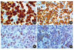2A:肿瘤细胞ALK标记,胞质及胞核内见棕褐色颗粒;2B:肿瘤细胞ALK胞质内表达;2C:肿瘤细胞c-myc胞核内表达;2D:肿瘤细胞c-myc胞核及胞质内表达
