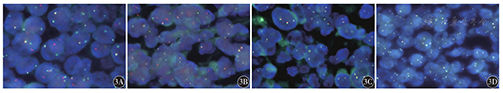 3A: ALK基因易位,肿瘤细胞核中可见典型的分离信号;3B: ALK基因易位合并多拷贝;3C: ALK基因3拷贝;3D:c-myc基因4拷贝
