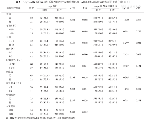 c-myc、ALK蛋白表达与系统性间变性大细胞淋巴瘤(ALCL)患者临床病理特征的关系[例(%)]