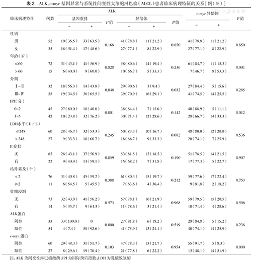 ALK、c-myc基因异常与系统性间变性大细胞淋巴瘤(ALCL)患者临床病理特征的关系[例(%)]