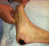 患者如存在感染(如甲沟炎、皮肤感染)、严重肢体缺血、软组织坏死征象,X线片显示气体、足踝关节骨折错位时,应请专家紧急会诊,即使感染不严重或仅为足踝部水肿。需要评估患者的实验室指标和皮肤状态。足畸形可以增加擦伤和局部压力造成的溃疡(如图1),因此所有患者均需采取措施以减少足跟的压力。