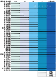 (3)烟酸:烟酸的降脂作用机制尚不明确,可能与抑制脂肪组织中的脂解和减少肝脏中VLDL合成和分泌有关,此外,烟酸还具有促进脂蛋白酶的活性,加速脂蛋白中TG的水解的作用,因而其降低TG的作用明显。但烟酸可导致糖代谢异常或糖耐量恶化,一般不推荐在糖尿病患者中使用,若必须使用,应该定期监测血糖水平。烟酸和阿昔莫司在肾功能减退患者中应用证据有限,应谨慎或减量使用。