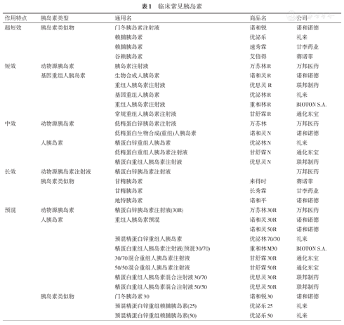 根据药物动力学的特点,临床上胰岛素制剂可被分为超短效(速效)胰岛素类似物、短效(常规)胰岛素、中效胰岛素、长效胰岛素制剂(包括长效胰岛素和长效胰岛素类似物)和预混胰岛素制剂(包括预混胰岛素和预混胰岛素类似物)(表1)。