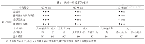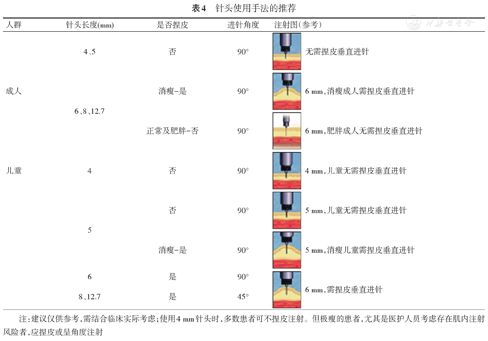 注:建议仅供参考,需结合临床实际考虑;使用4 mm针头时,多数患者可不捏皮注射。但极瘦的患者,尤其是医护人员考虑存在肌内注射风险者,应捏皮或呈角度注射