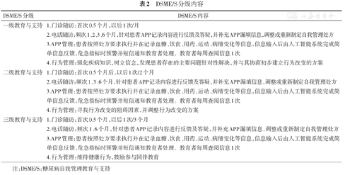 基于已建立的糖尿病分层分级管理路径,在病员首诊时即通过综合评估建档,按年龄、血糖、糖化血红蛋白、低血糖、自我管理行为、并发症和合并症等7个指标将患者分为高危层、中危层、平稳层,分别制定DSME/S的等级和不同层级的自我管理处方(内容包括控制目标、饮食管理、血糖监测、营养治疗、运动治疗及知识学习)。日常随诊包括随访(门诊、电话)、APP管理和行为管理。不同层次患者的日常随诊内容不同,若发现患者出现影响自我管理新的复杂因素(指出现新的健康状况如肾脏疾病、卒中及需要复杂药物;出现身体机能受限如视力受损、移动受限;出现情感因素如焦虑和抑郁;出现基本生活需求如食物获取和经济能力有限时)、管理方案发生改变时(指生活环境、认知功能等相关因素变化)[4]以及最终6个月管理结束时,需调整或重新制定自我管理处方,若患者想延长DSME/S时间,则可6个月后重新评估分层(见图1)。