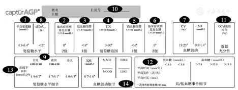 注:*参考范围由正常人群计算得出;1级=需要注意;2级=需要立即采取措施;AGP:可视化血糖分析报告;eHbA1c:估算HbA1c;TIR:血糖在目标范围内时间;CV:变异系数;SD:标准差;CGM:持续葡萄糖监测;AUC:曲线下面积;IQR:四分位间距;MAGE:平均血糖波动幅度;MODD:日间血糖平均绝对差;HBGI:高血糖指数;LBGI:低血糖指数;1:平均血糖;2:处于2级低血糖(<3.0 mmol/L)的时间比例(临床显著/极低/需要立即干预);3:处于1级低血糖(3.0~3.9 mmol/L)的时间比例(警戒值/低/需监测);4:处于目标范围(3.9~10.0 mmol/L,可设定个体化目标)的时间比例;5:处于1级高血糖(>10.0 mmol/L)的时间比例(警戒值/升高/需监测);6:处于2级高血糖(>13.9 mmol/L)的时间比例(临床显著/非常高/需要立即干预);7:血糖波动(主要指标CV,次要指标SD);8:估算HbA1c;9:3个时间段的血糖参数(夜间、日间、全天);10:数据收集阶段(至少2周);11:收集数据占预期数据的比例;12:低血糖/高血糖事件;13:曲线下面积;14:低血糖/高血糖风险[低血糖指数(LBGI)、高血糖指数(HBGI)]
