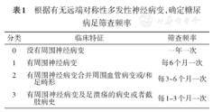 (4)根据有无远端对称性多发性神经病变,确定糖尿病足筛查的频率[52],见表1。