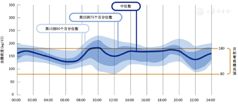 也称血糖波动,是指血糖水平在其高峰和低谷之间变化的不稳定状态,可以从日内血糖波动和日间血糖波动来评估血糖波动。日内波动主要通过AGP图谱的中位数曲线的起伏情况来判定,四分位数区间(interquartile range,IQR)及十分位数区间(interdencile range,IDR)主要用来评估日间血糖波动,IQR为第25和第75百分位数曲线之间的宽度,宽度越大说明血糖波动越大,IQR被认为是表达血糖变异性的最合适的数值,2017《持续葡萄糖监测国际共识》[4]也强调了IQR的重要地位。