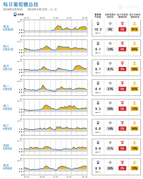 评价葡萄糖达标情况,可以采用平均葡萄糖水平、TIR、预估HbA1c(estimated HbA1c,eHbA1c)。共识推荐的TIR默认葡萄糖范围值为3.9~10.0 mmol/L,应尽量延长患者血糖在该范围的时间。根据14 d中的葡萄糖数据,可计算出eHbA1c(eHbA1c可以避免因血红蛋白疾病或人种差异造成的HbA1c检测误差)。
