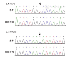 后续治疗中发现,患者在每日静脉补氯化钾3 g以上,且饮食正常,无呕吐、腹泻等消化道症状的情况下血钾水平仍持续偏低,入院第3天至第5天随访血钾水平分别为2.7、2.8、3.0 mmol/L。考虑到入院后患者顽固性低钾血症难以纠正,进一步完善血电解质及24 h同步尿电解质、甲状腺功能、肾素-血管紧张素-醛固酮系统及血压监测等以排除其他引起低钾的内分泌疾病。患者血、尿同步电解质检查结果提示存在低血镁、尿钾相对增多(表1);直立位直接肾素浓度198.0(正常参考值4.4~46.1)μU/ml,直立位醛固酮19.3(正常参考值2.5~35.2)ng/dl,血浆醛固酮与肾素比值=0.1。24 h动态血压提示全天平均血压109/63 mmHg,甲状腺功能、肾脏影像学检查未见异常。综合患者尿钾排出增多,血压正常但肾素-血管紧张素-醛固酮系统激活等特点,考虑Gitelman综合征可能。进一步完善SLC12A3基因突变筛查,发现患者SLC12A3基因中存在2个杂合致病突变,分别为核苷酸突变:c.1077C>G(氨基酸突变:p.N359K)和核苷酸突变:c.635G>T(氨基酸突变:p.G212V),确诊为Gitelman综合征(图1)。