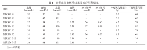 | 时间 | 血钾(mmol/L) | 血钠(mmol/L) | 血氯(mmol/L) | 血镁(mmol/L) | 24 h尿钾(mmol) | 24 h尿钙(mmol) | 补充氯化钾量(g) | 胰岛素用量(U/d) |