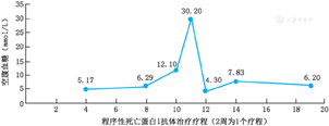 患者为52岁女性,2013年6月3日因左肺腺癌于南京市胸科医院行肺癌根治术。2015年患者肺部再次出现结节性病变,后未予特殊治疗。2017年患者于南京市肿瘤医院行培美曲塞联合顺铂化疗2个月(4个周期),之后未再接受化疗。2018年3月患者接受PD-1抗体SHR-1210(江苏恒瑞医药股份有限公司)治疗非小细胞肺癌的临床研究(PD-1抗体SHR-1210治疗晚期/转移性非小细胞肺癌患者的开放性、单臂、多中心的Ⅱ期临床研究)。PD-1抗体治疗周期为2周一个疗程。5月2日患者空腹血糖5.17 mmol/L,仍在正常范围内。7月2日,患者已行PD-1抗体治疗8个疗程(16周),查空腹血糖6.29 mmol/L,处于空腹血糖受损,未引起重视。患者继续PD-1抗体治疗2个疗程后,7月30日出现明显口干,饮水量、尿量增多,易饥善食等症状,与此同时体重下降约3 kg,查空腹血糖12.1 mmol/L。8月8日患者出现恶心呕吐症状,次日于本院急诊查血糖30.2 mmol/L,尿糖4+,尿酮体3+,血气分析提示pH值为6.979,碱剩余为-27 mmol/L,诊断为糖尿病酮症酸中毒,经补液静脉胰岛素使用等措施处理后转入我院内分泌科继续诊治。