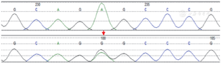 患者 男,汉族,17岁。因“抽搐2周”于2017年7月20日就诊于我院。患者2周前无明显诱因出现发作性意识丧失伴肢体抽搐,伴精神异常,发作时双眼斜视、双手握拳、四肢抽搐、意识丧失,持续数分钟,完善颅脑磁共振检查示右颞顶叶皮层区多发性脑梗死灶可能性大,小脑和脊髓萎缩。给予奥卡西平300 mg,每日两次,未再发作。2年后患者出现消瘦,体重减轻10 kg,无烦渴、多饮、多尿、胸痛、呼吸困难等。出生后运动发育、智力及生理发育与同龄儿无异,即将完成高中学业,成绩一般,性格易怒。家族史:母亲、外婆患糖尿病,均30余岁起病,否认家族中其他成员患此病及其他遗传相关性疾病。体格检查:身高168 cm,体重55 kg,体质指数19.49 kg/m2,体重最高65 kg,血压正常。神清,反应稍迟钝,记忆力、计算力较差,理解力、定向力一般,双侧眼睑无下垂,眼球活动自如,眼震(+/-)。双侧瞳孔等大等圆,对光反射灵敏。双侧鼻唇沟无变浅,伸舌居中。视力:左眼0.8,右眼1.0;颈软,无抵抗。心肺腹查体未见明显异常。四肢肌力5级,肌张力正常,腱反射(+),脑膜刺激征、病理征未引出,指鼻试验、轮替试验欠稳准,深浅感觉无异常。辅助检查:空腹血糖11.87 mmol/L,糖化血红蛋白13%,C肽3.44 ng/ml,胰岛素14.08 mIU/L,肌酸激酶205 U/L,肌酸激酶同工酶75 U/L。动脉血气:pH 7.37。乳酸1.7 mmol/L。尿常规:尿糖(3+),酮体(+),蛋白(+/-);尿微量白蛋白/肌酐39.38 mg/g。超声心动图:左心室舒张末期内径5.2 cm,左心室后壁舒张期厚度1.2 cm,左心室射血分数50%,左心室扩大,左心室心肌肥厚,二尖瓣反流,左心室舒张与收缩功能减低。眼科及听力检查未见明显异常。基因检测方法:采集患者外周血2 ml,-20 ℃低温保存备用。由青岛金域医学检验所利用QIAamp DNA试剂盒提取外周血的基因组DNA,经纯化、扩增、测序后筛选出3243位点所在的mt.3150~3403为可疑突变片段,设计引物进行PCR扩增后利用Sanger法基因测序,可见mt.3243A>G杂合突变,变异频率约为56%(图1)。