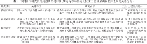 不同临床研究设计类型的关键特征、研究内容和目的比较(以2型糖尿病和肥胖之间的关系为例)