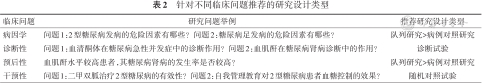 | 病因学 | 问题1:2型糖尿病发病的危险因素有哪些?问题2:糖尿病足发病的危险因素有哪些? | 队列研究>病例对照研究 |