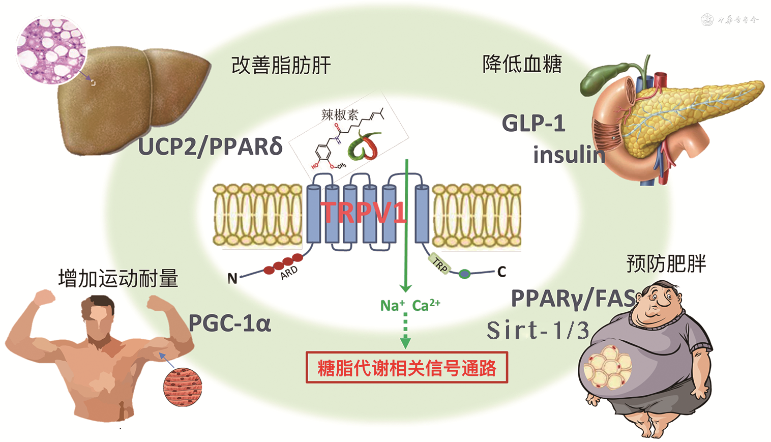 注:TRPV1为瞬时受体电位香草酸亚家族成员1;UCP2为解耦蛋白2;PPARδ为过氧化物酶体增殖物激活受体δ;GLP-1为胰高糖素样肽-1;insulin为胰岛素;PGC-1α为过氧化物酶体增殖物激活受体γ共激活因子-1α;PPARγ为过氧化物酶体增殖物激活受体γ;FAS为脂肪酸合酶;Sirt-1/3为去乙酰化酶1/3