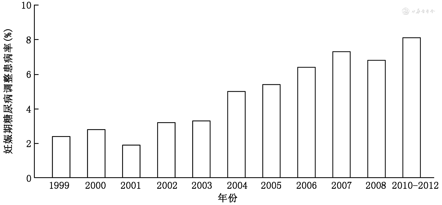 天津妊娠期糖尿病预防项目始于1998年12月,由市内6区的社区医院筛查与转诊系统及天津市妇保所设立的GDM门诊组成。孕妇于孕26~30周在社区医院使用50 g口服葡萄糖耐量试验(oral glucose tolerance test,OGTT)进行筛查(2000年后筛查时间改为孕24~28周)。50 g OGTT 1 h血糖≥7.8 mmol/L则为阳性,阳性者需转诊至天津市妇保所GDM门诊进行75 g OGTT。根据世界卫生组织(World Health Organization,WHO)1999糖尿病诊断标准对OGTT结果进行解读,空腹血糖(fasting plasma glucose,FPG)≥7.0 mmol/L或糖负荷后2 h血糖(2-hour postprandial glucose,2hPG)≥11.1 mmol/L诊断为糖尿病;2hPG≥7.8 mmol/L但<11.1 mmol/L诊断为糖耐量受损(impaired glucose tolerance,IGT),糖尿病或IGT均定义为GDM[2]。天津妊娠期糖尿病预防项目于2010年10月转用国际糖尿病与妊娠研究小组(International Association Diabetes and Pregnancy Study Group,IADPSG)标准对GDM进行诊断[3]。我们的监测数据显示,自建立系统以来,天津市内6区GDM的患病率在10余年间呈现快速上升的趋势(图1)[4, 5]。