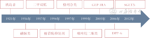 从100多年前胰岛素使用至今,糖尿病的药物治疗发生了巨大变化(图1)。从口服药到注射剂,从单一品种到众多选择,从医师经验用药到循证医学基础上的规范治疗,从以改善血糖为目标的治疗路径到以改善主要结局为驱动的治疗方案,糖尿病的药物治疗理念发生了巨大变化。我们基于国内外糖尿病防治指南的变迁,阐述不断更新的糖尿病治疗理念,并对其背后的循证医学证据进行解析。