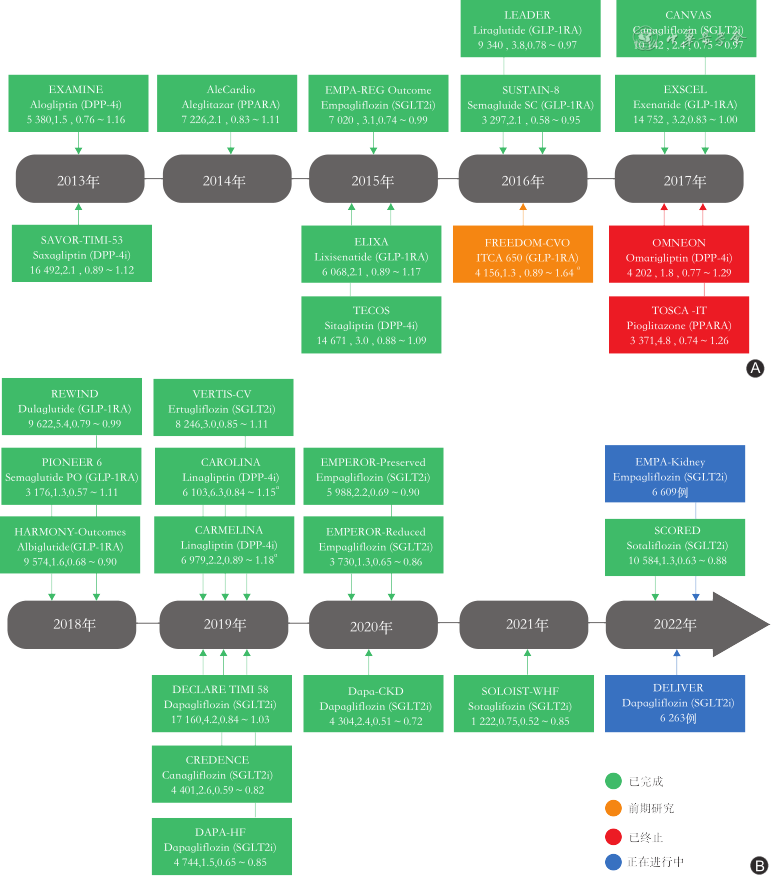 2015年,首款钠-葡萄糖共转运蛋白2抑制剂(sodium-glucose cotransporter 2 inhibitor,SGLT2i)恩格列净的CVOT结果(EMPA-REG研究)公布,显示在心血管高危的糖尿病患者中使用恩格列净,可显著降低主要心血管终点事件(心血管死亡、非致死性心肌梗死、非致死性卒中)[49]。这一意外惊喜再一次深刻改变了我们对糖尿病的认识,其后涌现了达格列净、卡格列净、索格列净等一系列SGLT2i的随机、双盲、对照CVOT结局研究,DECLARE研究[50]、CANVAS研究[51]、SOLOIST-WHF研究[52]均以优效性达到CVOT终点。对糖尿病患者的心、肾保护作用引起医学界的广泛关注,并进一步扩大到非糖尿病领域,DAPA-CKD研究[53]、CREDENCE研究[54]显示,无论糖尿病和非糖尿病患者SGLT2i均有肾脏保护作用。针对心力衰竭的DAPA-HF研究[55]、EMPEROR-Reduced研究[56]、CHIEF-HF研究[57]推动SGLT2i写入心力衰竭管理指南。上述研究本身和二次分析结果,都证明了SGLT2i对靶器官的保护作用并不依赖血糖降低水平。