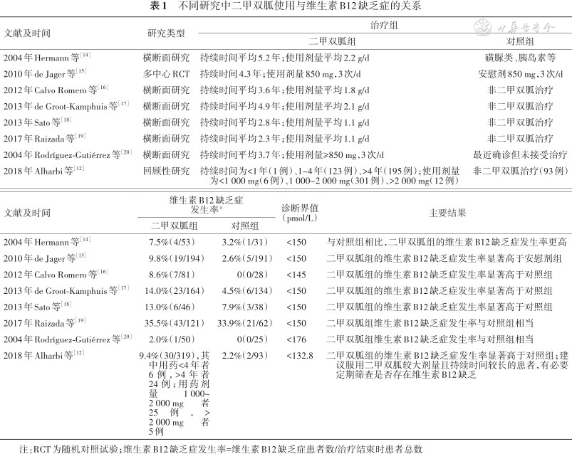 不同研究中二甲双胍使用与维生素B12缺乏症的关系